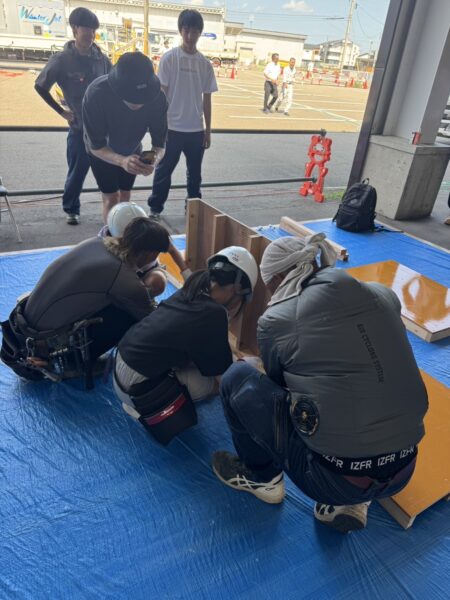 くぎを打ったり型枠を組み立てたりする型枠体験、空調服を着てみよう体験、腰袋と道具を付けて重たいものの体験。皆さん楽しんで、初めての経験をしてくれました。